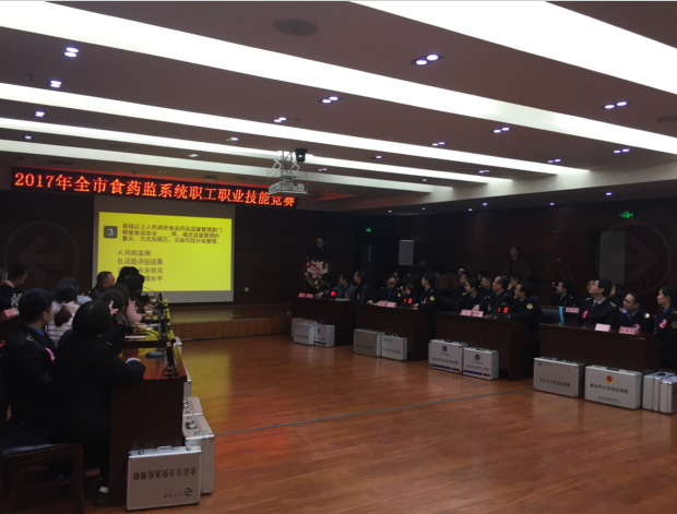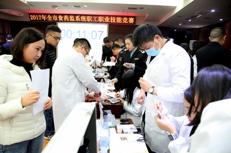 为进一步提高全市食品药品监管队伍食品检测业务能力和水平,12月25日,市食安办、市总工会、市食药监局联合举办了全市食药监系统职工职业技能竞赛。省食药监局朱佑富副巡视员、省食药监局风险监测处李翔处长,应急管理处肖学文副处长、市食安办主任、食药监局局长李勇,市总工会副主席梁山亲临现场指导。来自全市各县市区(园区)食药监部门的14支代表队参赛,市食药监局、市食药检所、市稽查支队、市不良反应监测中心及各县市区食药监管系统职工190余人到场观摩。