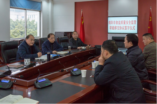 12月29日,绵阳市食盐质量安全监管职能移交协议签字仪式在市食品药品监督管理局会议室举行,市食药监局党组成员、副局长王军主持仪式,市局党组书记、局长李勇,市盐政稽查处董事长何平代表双方在食盐职能移交协议上签字,这标志着我市盐业监管体制改革工作取得阶段性成果,实现政企分开;意味着市食品药品监督管理局正式履行食盐生产经营质量安全管理与监督执法职责。